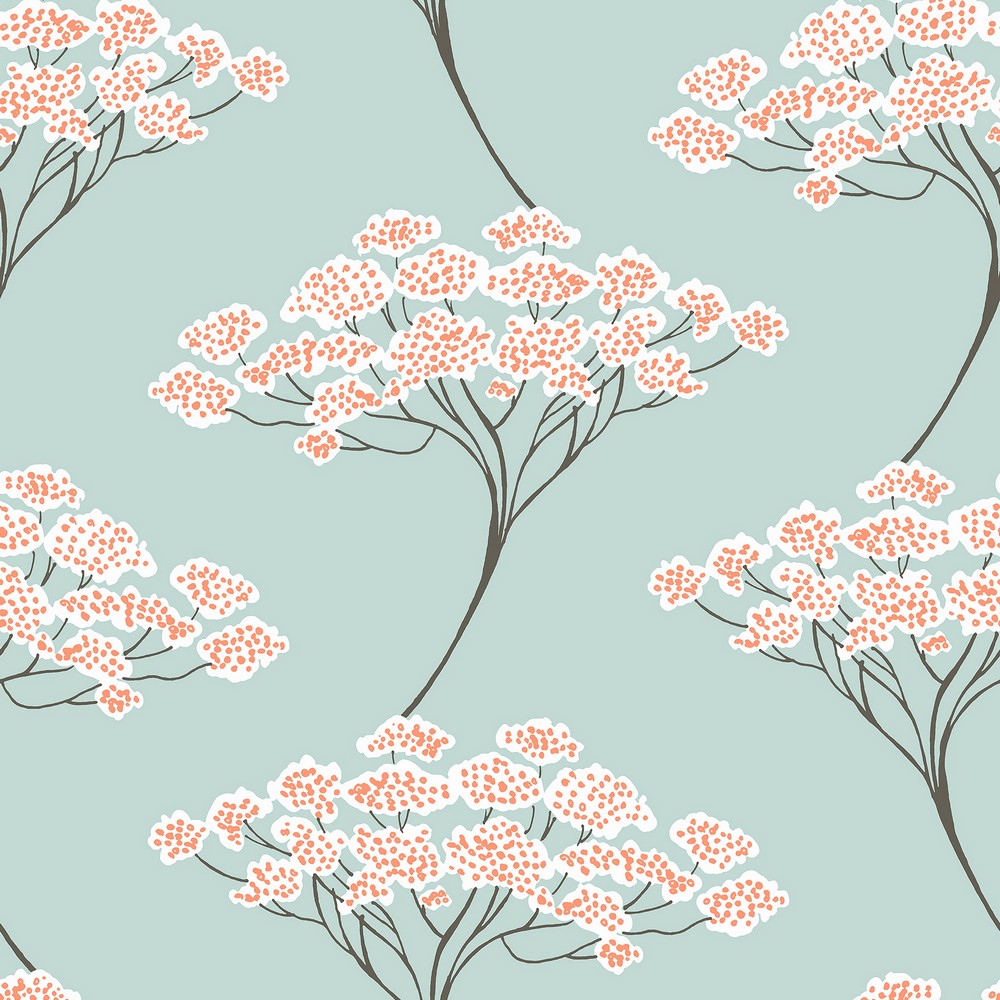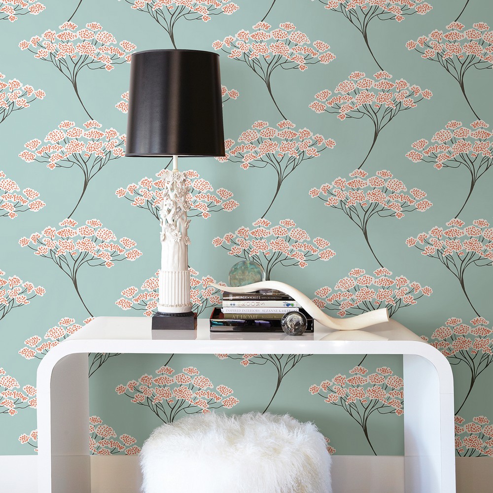 | Add a pop of color to your walls with this vivid banyan tree wallpaper. The chic design features a powder blue background with bright orange flower buds. Page: 29 Match: Straight Roll Width: 20.5 Roll Length: 33 Unpasted Strippable Asian And Oriental |