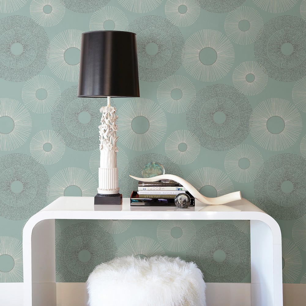| This blue wallpaper is a sparkling oasis. The modern star burst design is like a firework finale, shining with a holographic material. The robins egg blue colorway is bright and cheerful. Page: 31 Match: Straight Roll Width: 20.5 Roll Length: 33 Unpasted Strippable |