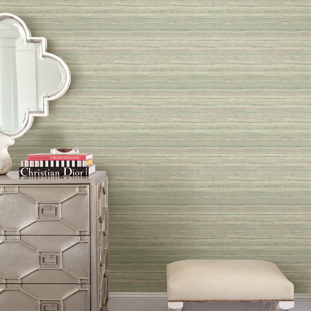 | Stripes get a fresh look in this green wallpaper. The design has a hand painted look with streaks of sage, cream, and taupe. A pearlescent finish adds a shimmering effect. Page: 56 Match: Straight Roll Width: 20.5 Roll Length: 33 Unpasted Strippable |