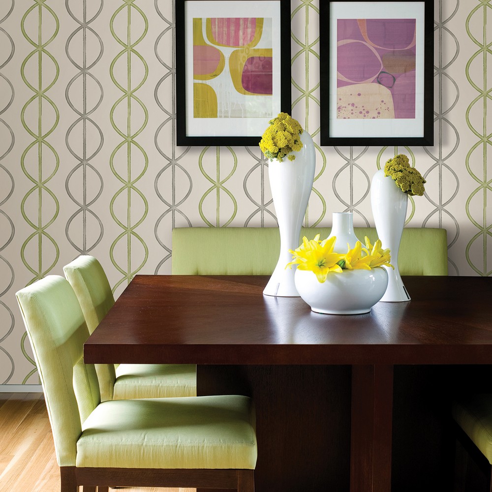 Flowing ribbons of color dance across this stripe wallpaper. The design features nuanced tones of grey and green for a chic, modern look.