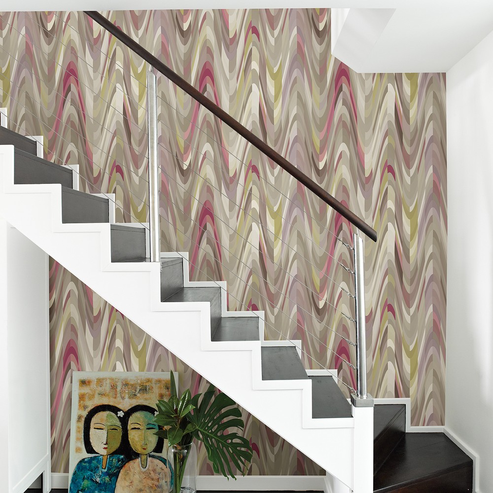 | Shades of pink from rose to bubblegum mix with neutral taupes and hints of lavender for a modern approach to color. The wave pattern in this geometric wallpaper creates an abundance of movement across the wall, undulating in and out of splashes of color. Page: 35 Match: Straight Roll Width (in): 20.5 Roll Length (ft): 33 Unpasted Strippable |