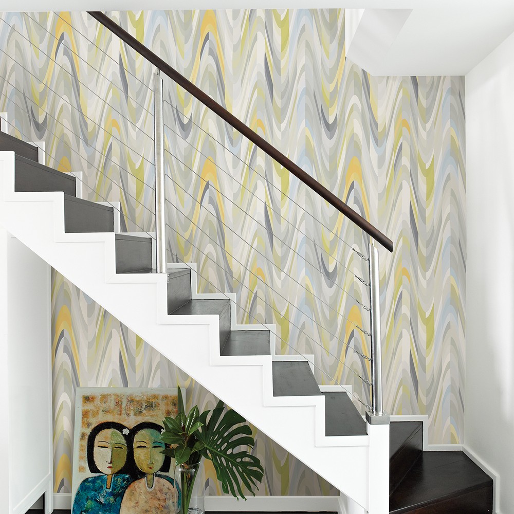 | Modern with a nod to the past. This retro wave wallpaper combines the bold style of the 1960s with a modern approach to color and design. The split print mixes serene shades of grey and green with bright pops of honey hued yellows. Page: 15 Match: Straight Roll Width (in): 20.5 Roll Length (ft): 33 Unpasted Strippable |