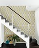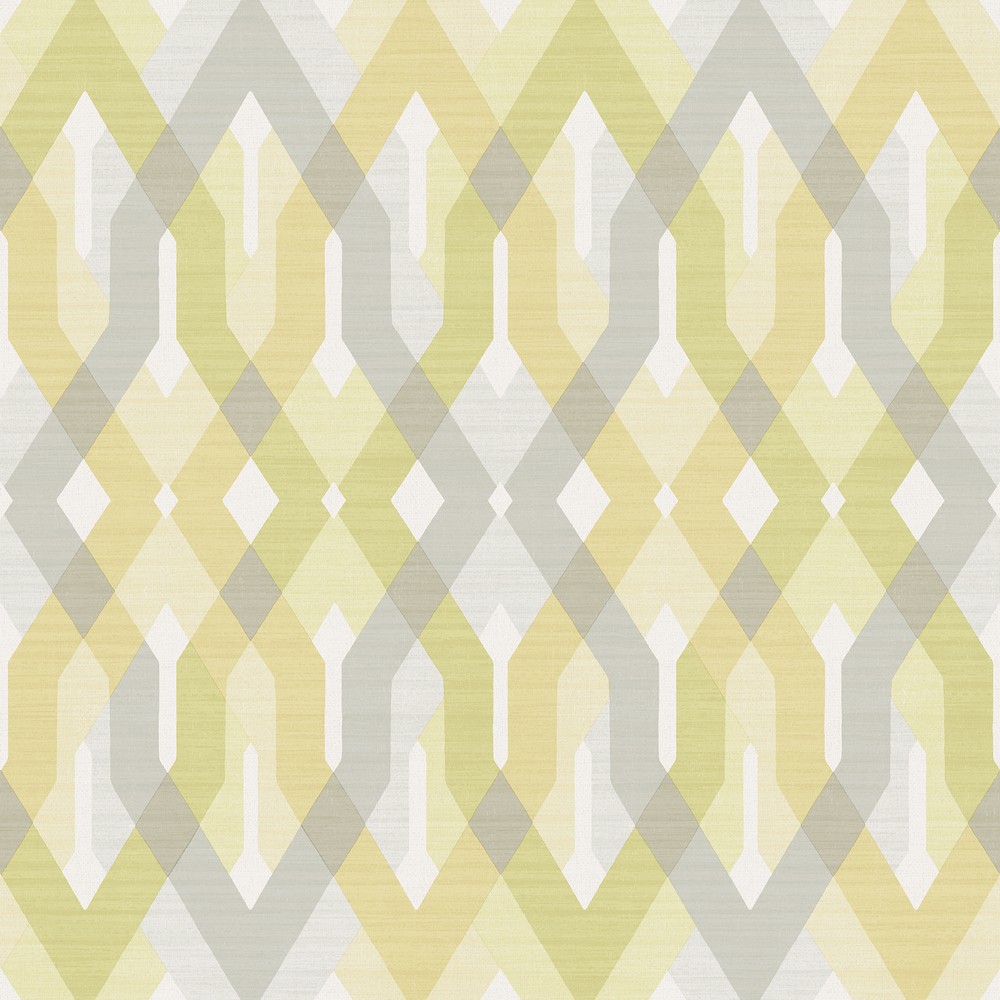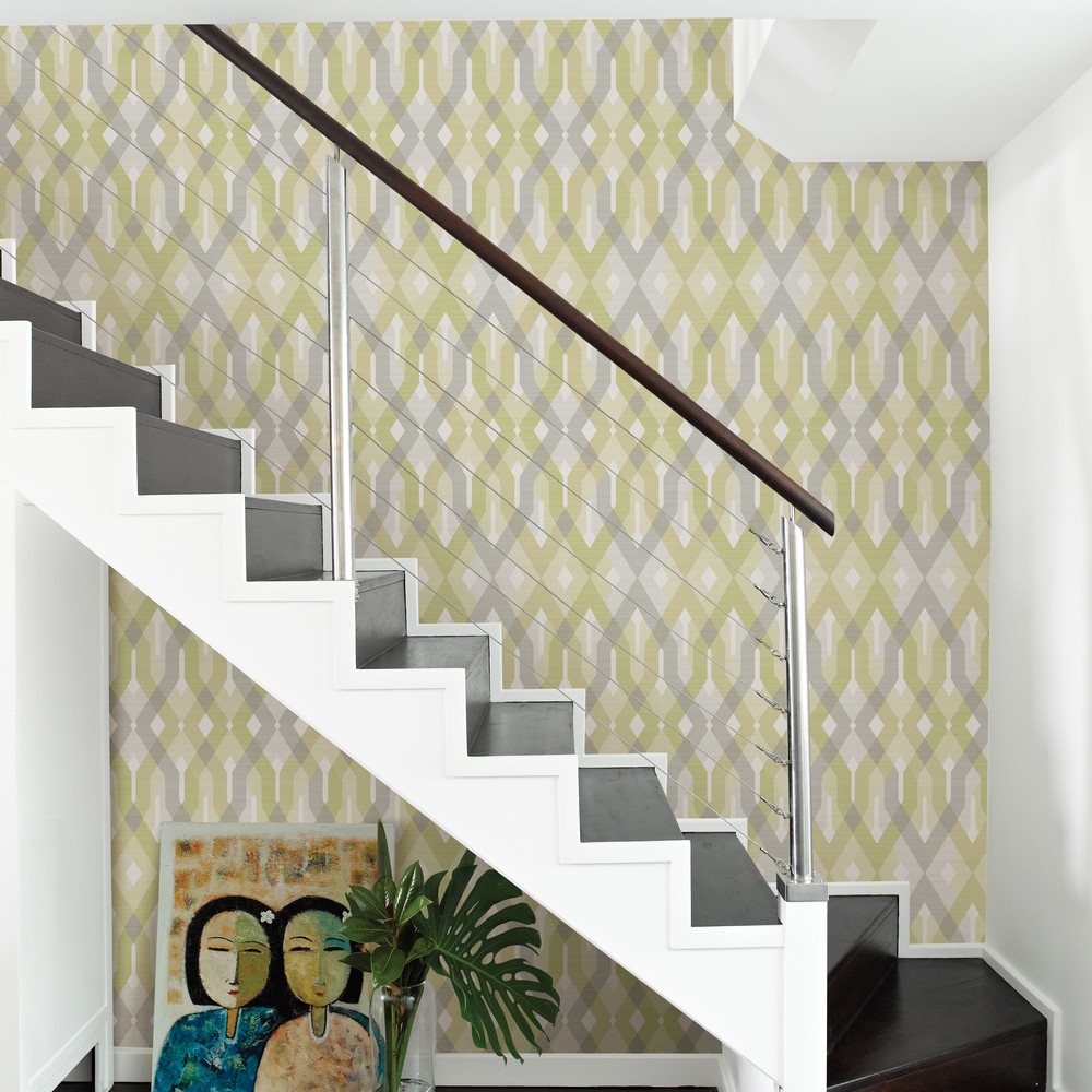 Cool greys contrast with warm yellows and greens in this lattice wallpaper. A texture effect background with a semi-sheer overlay make for a modern take on a classic design.