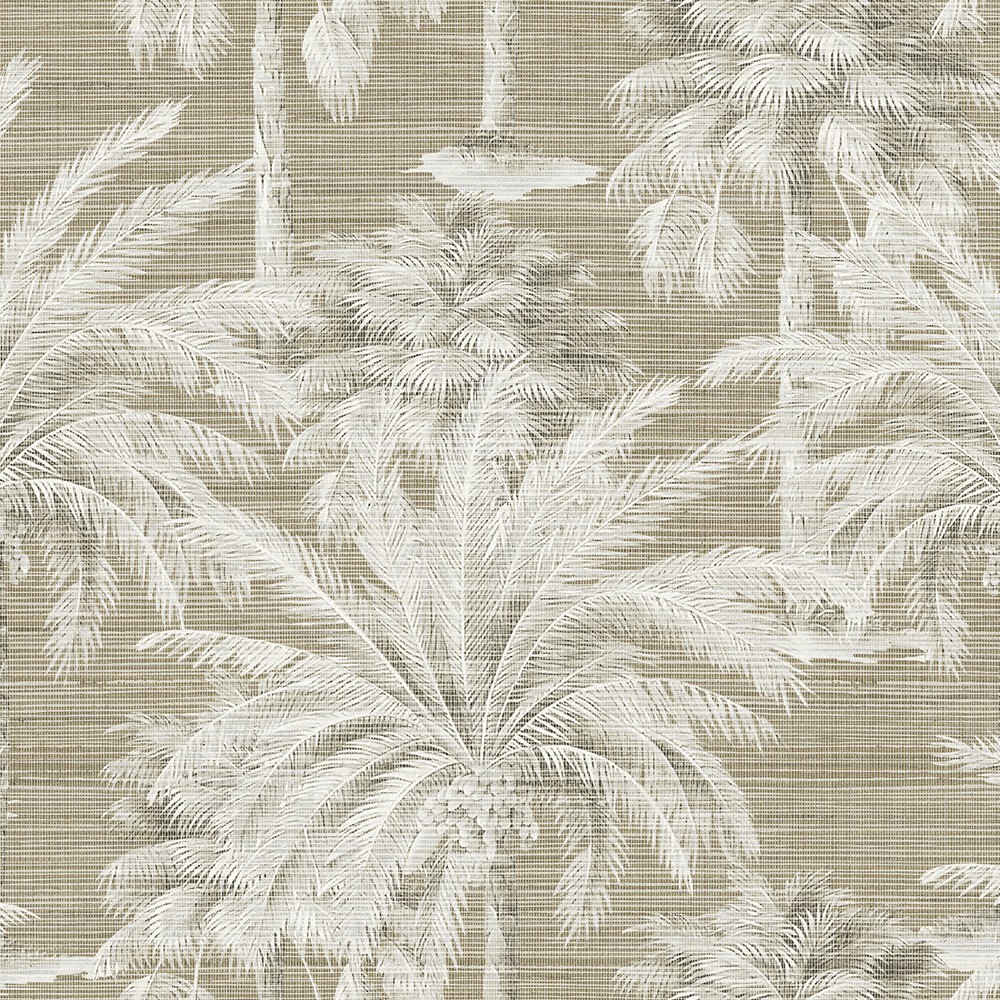 A beautiful palm print wallpaper with a textured string overlay. This cool brown design mixes a graphic print and a natural texture for a unique design. A tropical print perfect for a modern home.