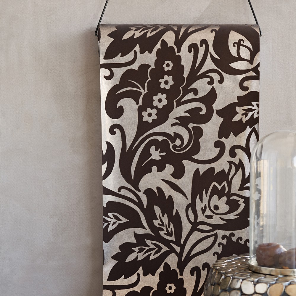 | This brown wallpaper is a stunner. A shiny silver tinted background has a vintage effect with subtle distressing. Atop this background is a velvet flocked large scale paisley print that has a palpably soft texture. Page: 44 Match: Drop Roll Width (in): 20.5 Roll Length (ft): 33 Unpasted Strippable Book: Eijffinger Whisper |