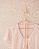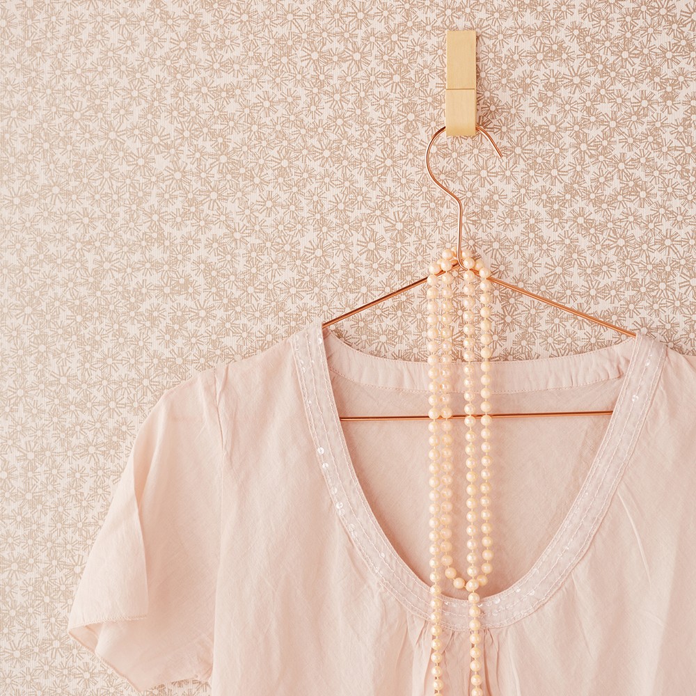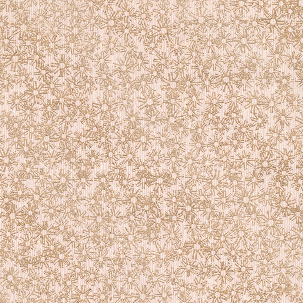 This glistening floral wallpaper has a modern rose gold color palette that pairs nicely with the 1960s style flowers. The background features thin lines of shimmering beige and matte pink.