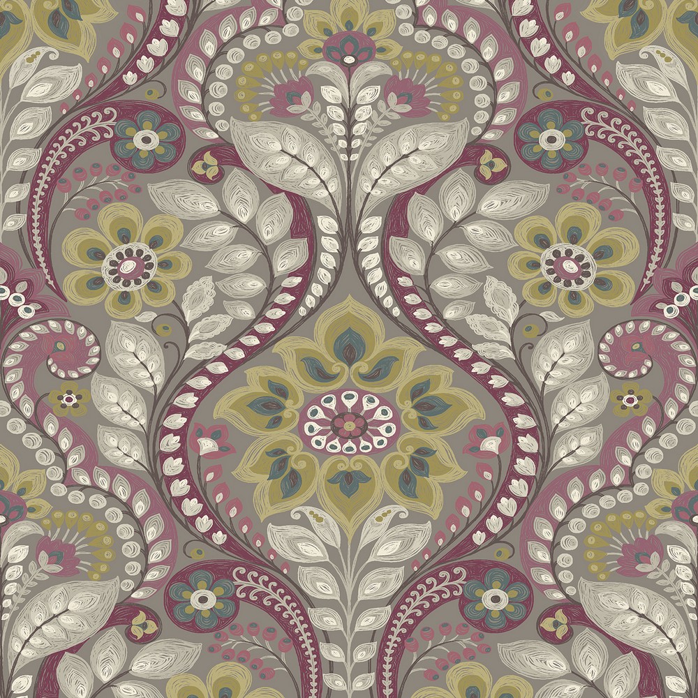 Hand drawn folk style floral damask on a grey background. The vibrant jewel tones include green and blue (peacock), burgundy, pink and purple with shades of grey and cream leaves.