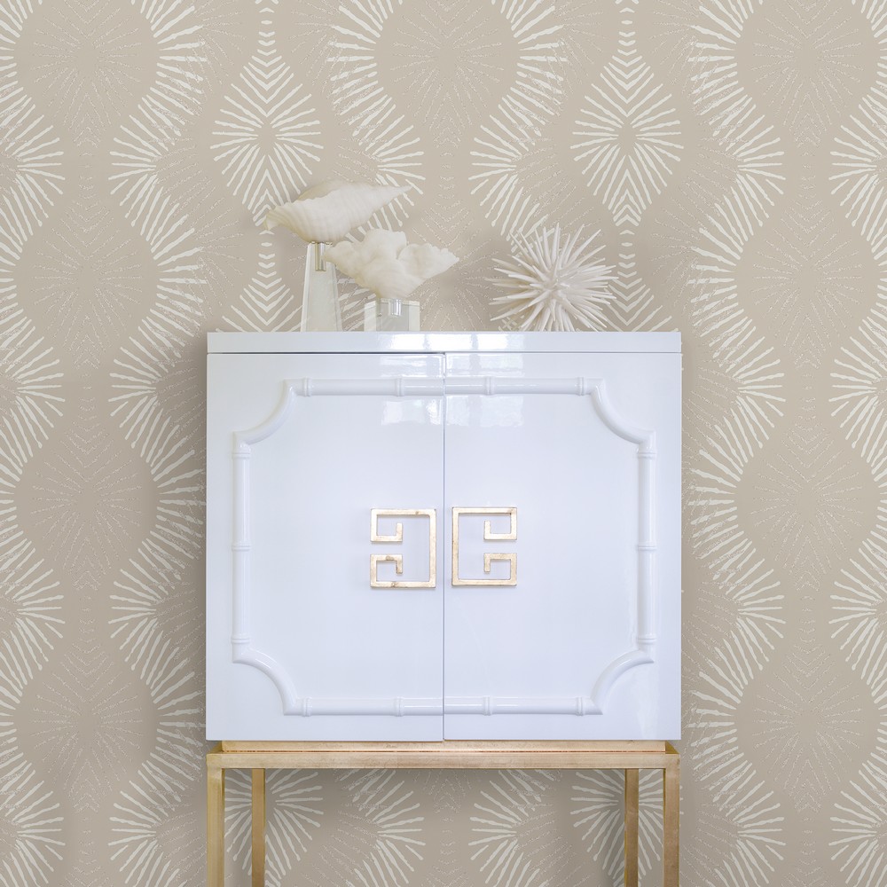 Beaded sections of this ogee design capture the light reflected from its metallic platinum background. A glamourous, mystical look for walls. Feliz is an unpasted, non woven wall covering.