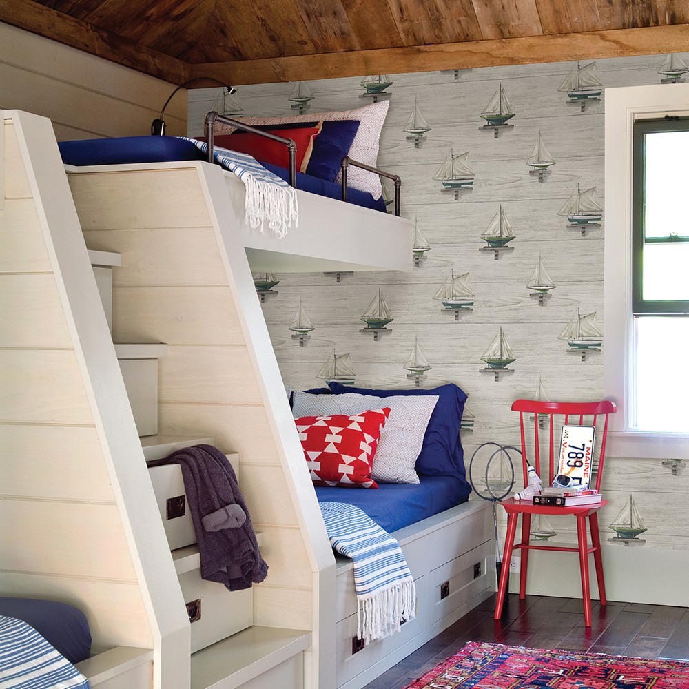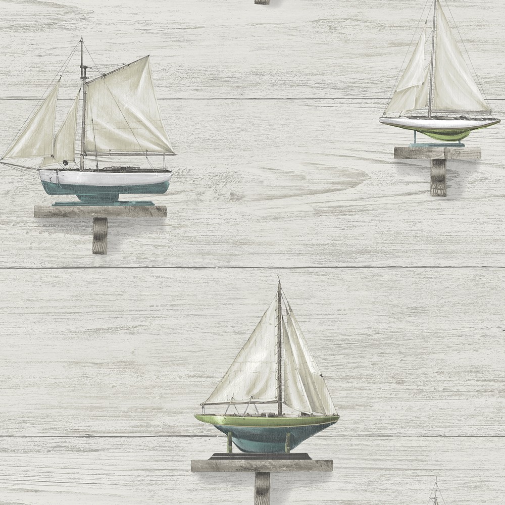 | Bring the winds of change to your walls with this wooden wall covering. Adorned with model sailboats, this classic design is perfect for a nautical home. 6.75 inch planks make a realistic look Chesapeake Page: 8 Match: Drop Double Roll Width (inches): 20.5 Double Roll Length (feet): 33 Prepasted Faux Effects Strippable Nautical |