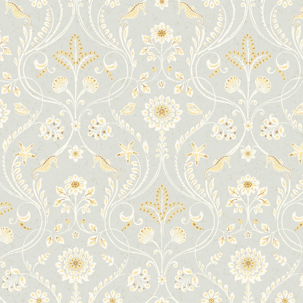 | Dive into the sea with this under water damask wall covering. Hidden among the swirls are seahorses, starfish, and shells. The grey and mustard color color scheme features subtle distressing. Chesapeake Page: 38 Match: Straight Double Roll Width (inches): 20.5 Double Roll Length (feet): 33 Prepasted Damasks Strippable Damask Wallpaper |