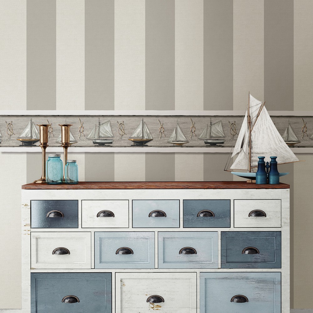 | A classic stripe wall covering. This grey and cream design has a texture finish. Stripes measure 5 inches. Chesapeake Page: 50 Match: Random Double Roll Width (inches): 20.5 Double Roll Length (feet): 33 Prepasted Stripes Strippable Striped |