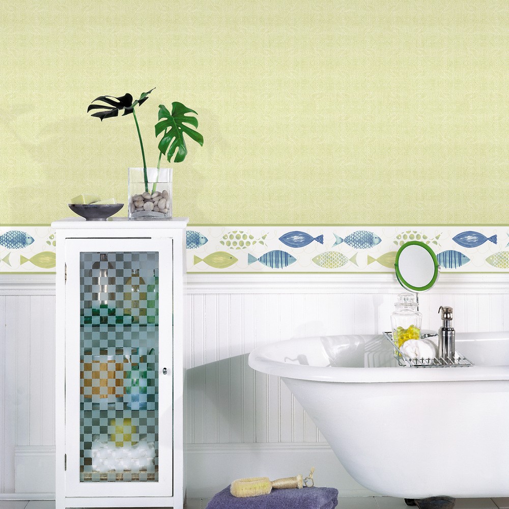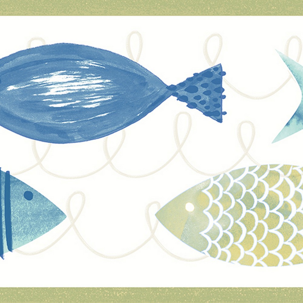 | This fish wall covering Spool is perfect for a beach house. Teal and green fish swim across the wall each with their own special print. A grey swirl tops off the design. Chesapeake Page: 67 Double Roll Width (inches): 6 Double Roll Length (feet): 15 Prepasted Animals Strippable Nautical Wallpaper Border |