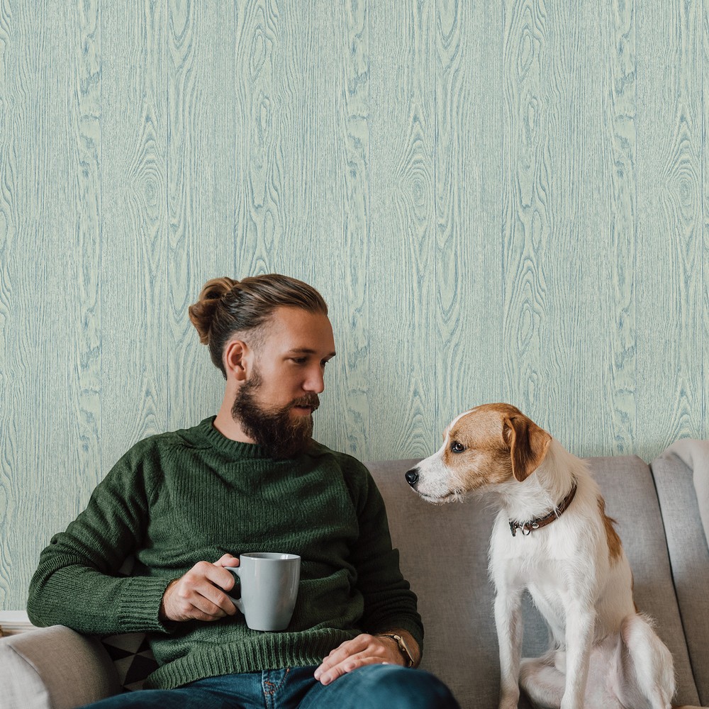 This wonderful faux wood plank wall covering has raised ink elements and grain details. The light blue wash on this wood print makes for an easy beachy look. Remi is an unpasted, non woven wall covering.