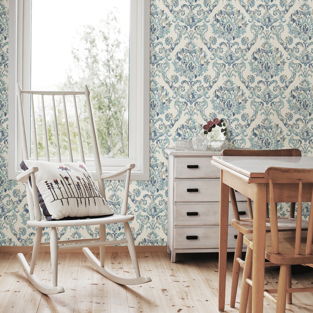| hip with a rustic twist, these damasks have shades of navy, olive, and teal. With Raised ink and gently faded color details gives this wall covering the appearance of being printed on wood. Shasta is a prepasted, high performance wall covering. Chesapeake Page: 34 Match: Straight Double Roll Width (inches): 20.5 Double Roll Length (feet): 33 Prepasted Damasks Strippable Damask Wallpaper |