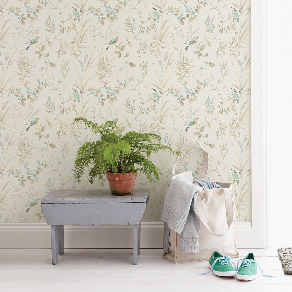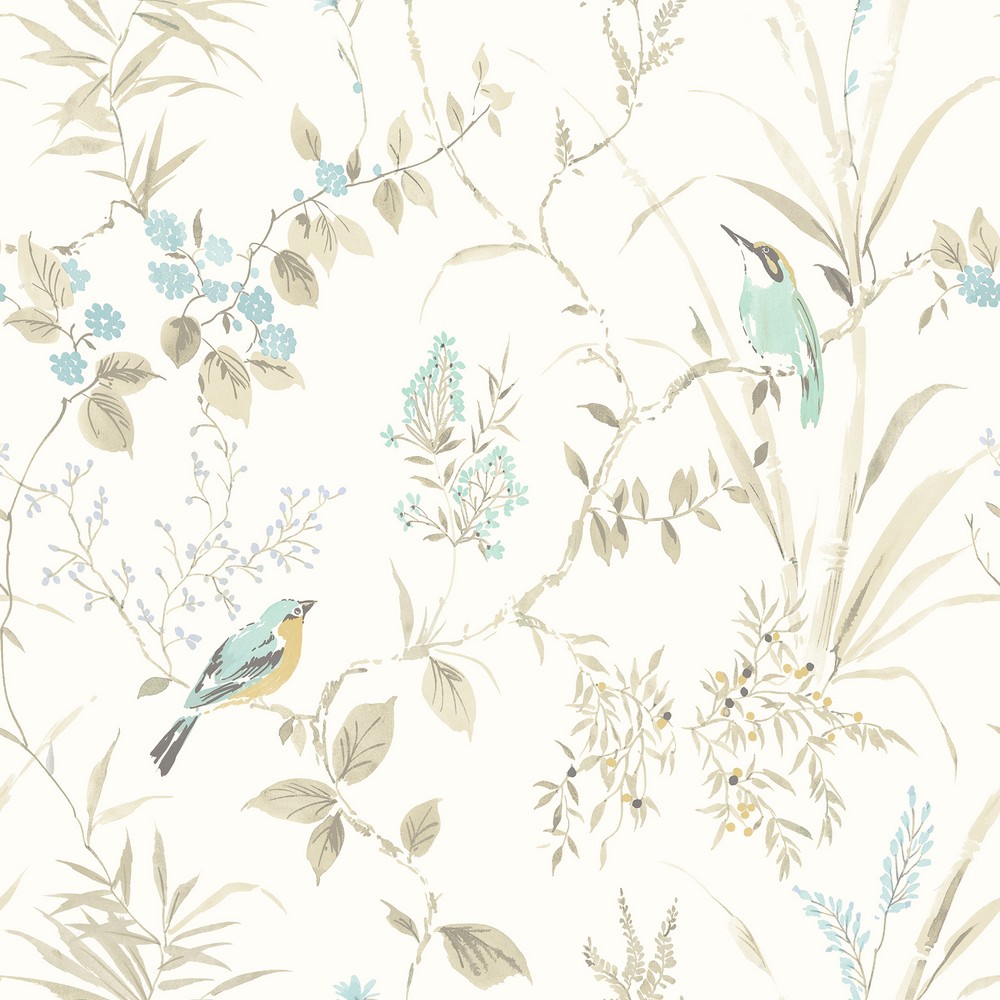 Light and airy, this romantic botanical print is teeming with life. Blue flowers and mint songbirds sit upon beige bamboo stalks in this chinoiserie wall covering. Imperial Garden is a prepasted, non woven wall covering.