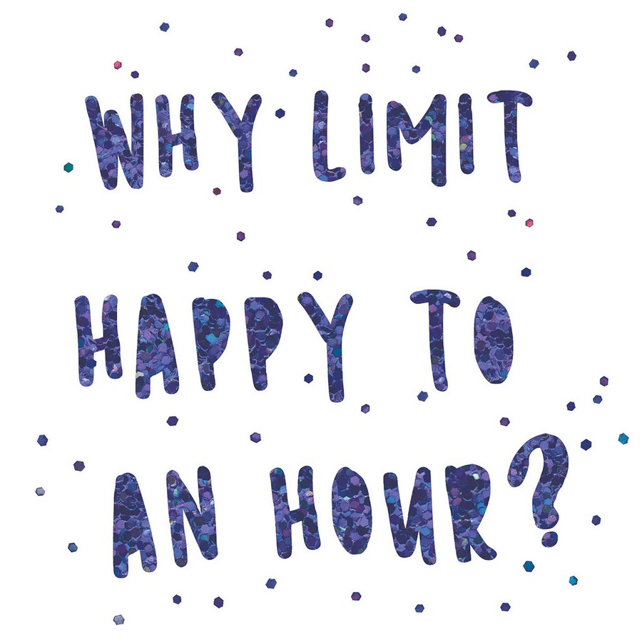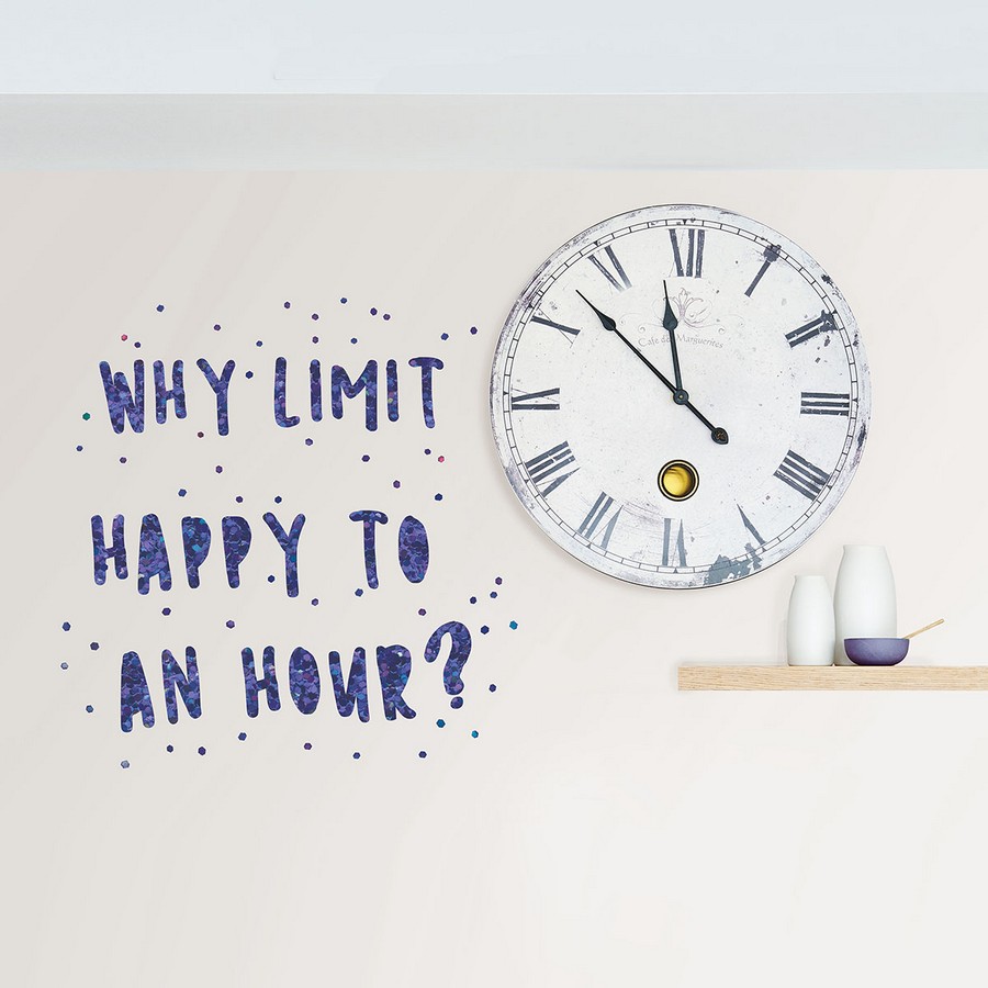 | Invite the good times of happy hour to your decor with this fun wall quote! Its purple and blue sequin text and the words, Why limit happy to an hour, will help keep the party going all night long, because wine not? Don't Limit Happy Hour Wall Quote Decals contains 51 pieces on 2 sheets that measure 17.25 x 9.75 inches. Repeat: No Repeat WallPops Wall Art Kits Wall Quotes # of Pieces: 51 current Wall Phrases Wall Phrases |