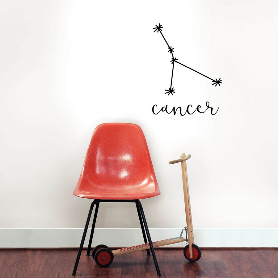 | Cancer, celebrate your emotional intelligence and intuition by displaying this astrology inspired wall art kit. Complete with your personal constellation and, Cancer, in a cursive script, these decals will add a dreamy flair to rooms. Cancer Wall Art Kit contains 2 pieces on 1 sheet that measures 17.5 x 24 inches. Repeat: No Repeat WallPops Wall Art Kits Wall Art Kits # of Pieces: 2 current Graphics Outer room |
