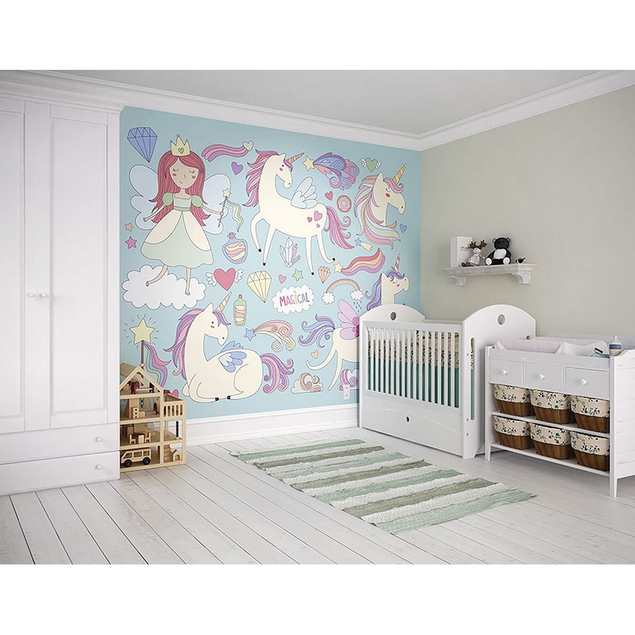 | Unicorns and a fairy princess flutter about shooting stars, fluffy clouds and hearts in this enchanting wall mural. Its hand drawn design and pastel color scheme emphasize its whimsical style. Unicorn Magic Wall Mural comes on 6 panels. Measures 9ft 10in x 7ft 10in when assembled Repeat: No Repeat ohpopsi Wall Murals Wall Murals # of Pieces: 6 Kids Novelty Animals Wall Murals And Wall Stickers Girls Wallpaper |