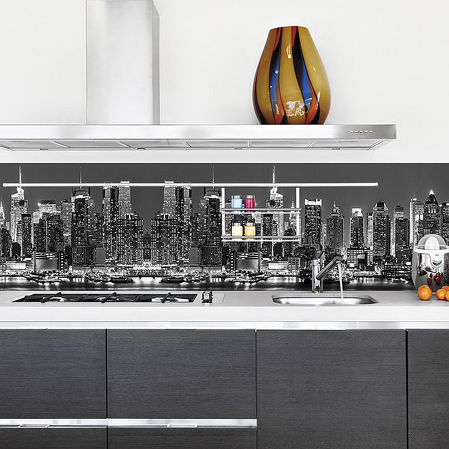 Featuring the stunning skyline of New York City, this peel and stick backsplash is truly mesmerizing. Its black and grey design emphasizes its upscale and current style. New York Skyline Peel and Stick Backsplash contains 1 piece on 1 sheet that measures 70.8 x 17.71 inches.