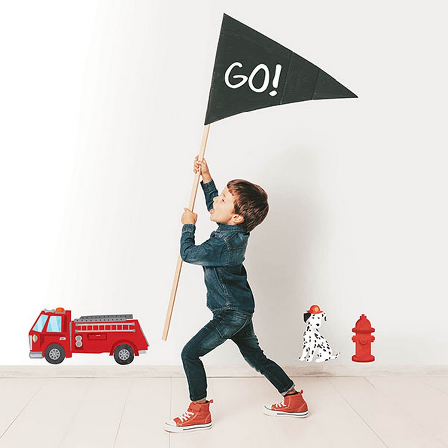 Turn up the heat and get creative with this happy wall art kit. A happy dalmatian sits in between a bright red fire truck and fire hydrant. Fire Station Wall Art Kit contains 3 pieces on 1 sheet that measures 17.5 x 24 inches. This product measures 17.5in x 24in when assembled.