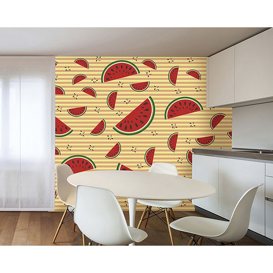 | A juicy watermelon print splashes around on a coral and yellow stripe backdrop in this tasty mural. Printed on non woven paper and measures 8-ft-3-in tall and12-ft wide when assembled. Watermelons with Orange Vintage Backdrop Wall Mural comes on 4 panels. Paste is included. Repeat: No Repeat Ideal decor Wall Murals Wall Murals # of Pieces: 4 Kids Fruit Fruit Wall Murals And Wall Stickers |