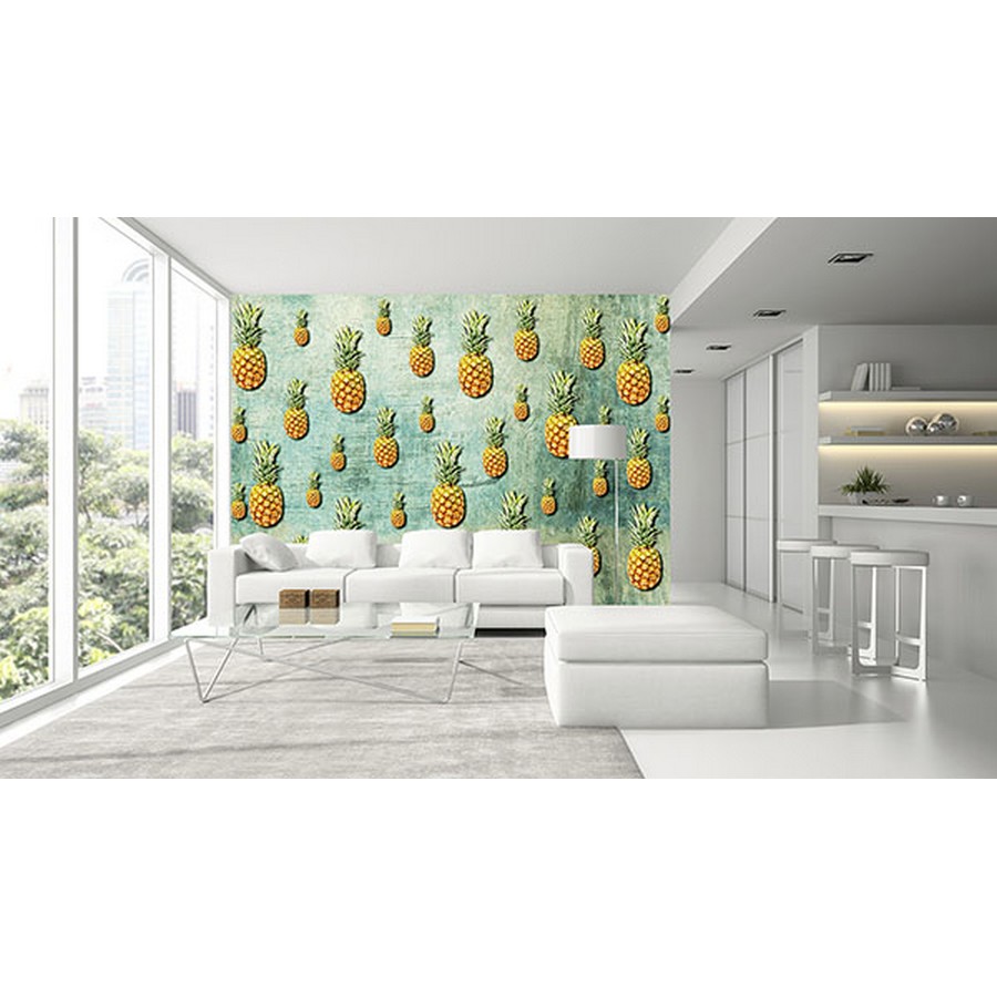 Classic yet eclectic, this pineapple print stands out on a teal gradient backdrop. Printed on non woven paper and measures 8-ft-3-in tall and12-ft wide when assembled. Tropical Pineapples Wall Mural comes on 4 panels. Paste is included.
