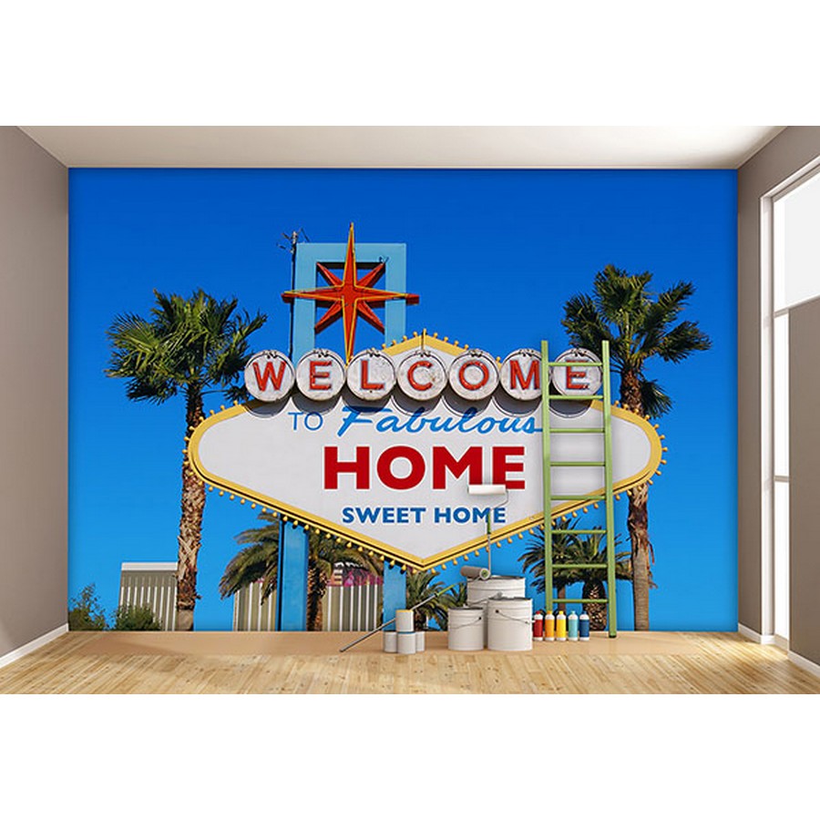 | This photorealistic mural features a retro sign in-between palm trees that reads, Welcome to Fabulous Home Sweet Home. Printed on vinyl coated paper and measures 8-ft-3-in tall and12-ft wide when assembled. Welcome to Vegas Wall Mural comes on 4 panels. Paste is included. Repeat: No Repeat Ideal decor Wall Murals Wall Murals # of Pieces: 4 Photographic Novelty Novelty |
