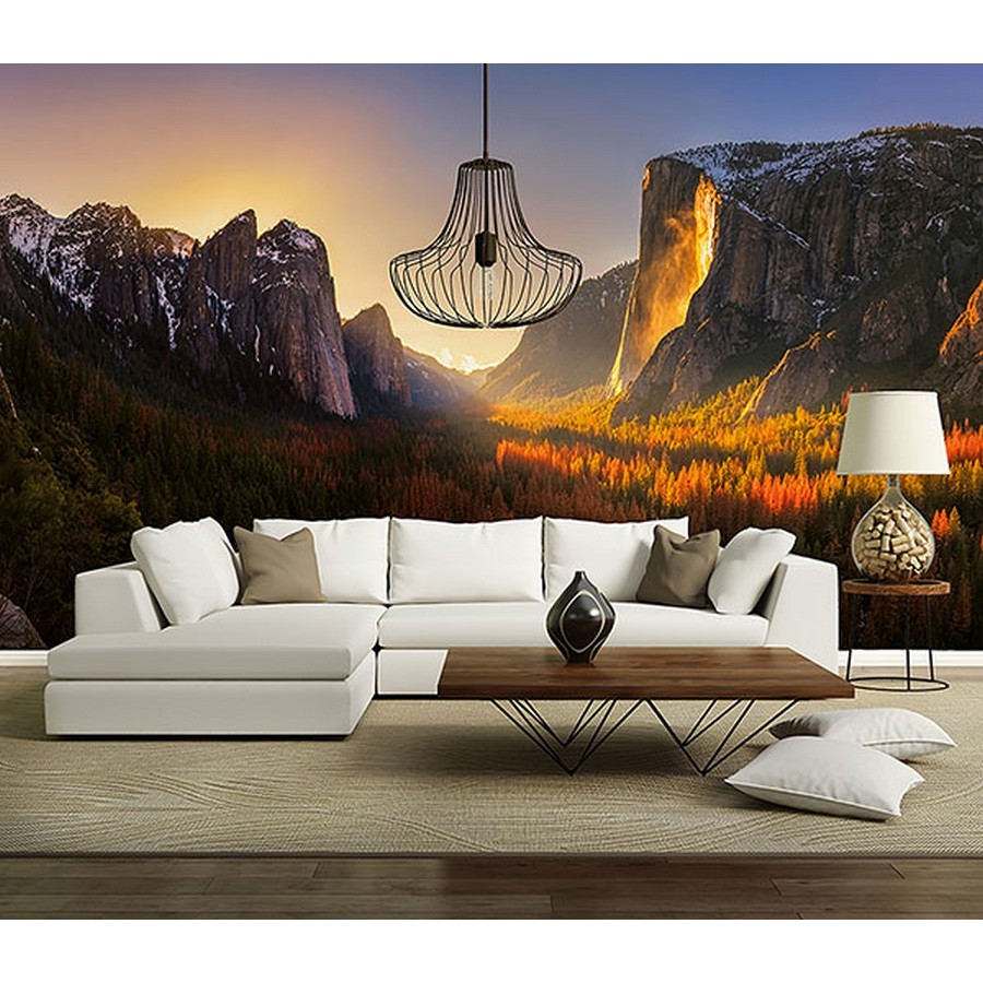 | A sunset shines behind the mountain range of the Yosemite in this mural. Printed on vinyl coated paper and measures 8-ft-3-in tall and12-ft wide when assembled. Yosemite National Park USA Wall Mural comes on 4 panels. Paste is included. Repeat: No Repeat Ideal decor Wall Murals Wall Murals # of Pieces: 4 Scenic Trees Trees |