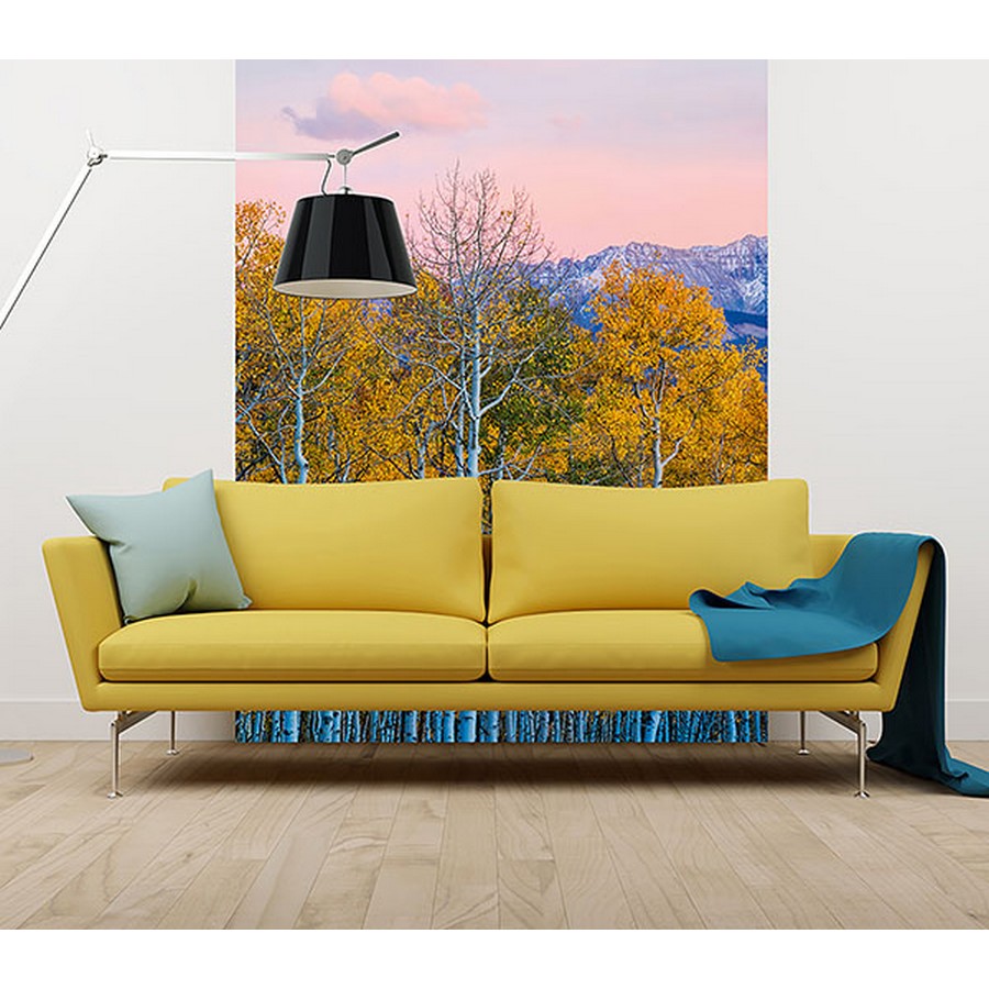 Soft shades of yellow, blue, and red adorn this vivid mountain landscape. Printed on vinyl coated paper and measures 8-ft 3-in high and 6-ft wide when assembled. Birch Trees in Fall Wall Mural comes on 2 panels. Paste is included.