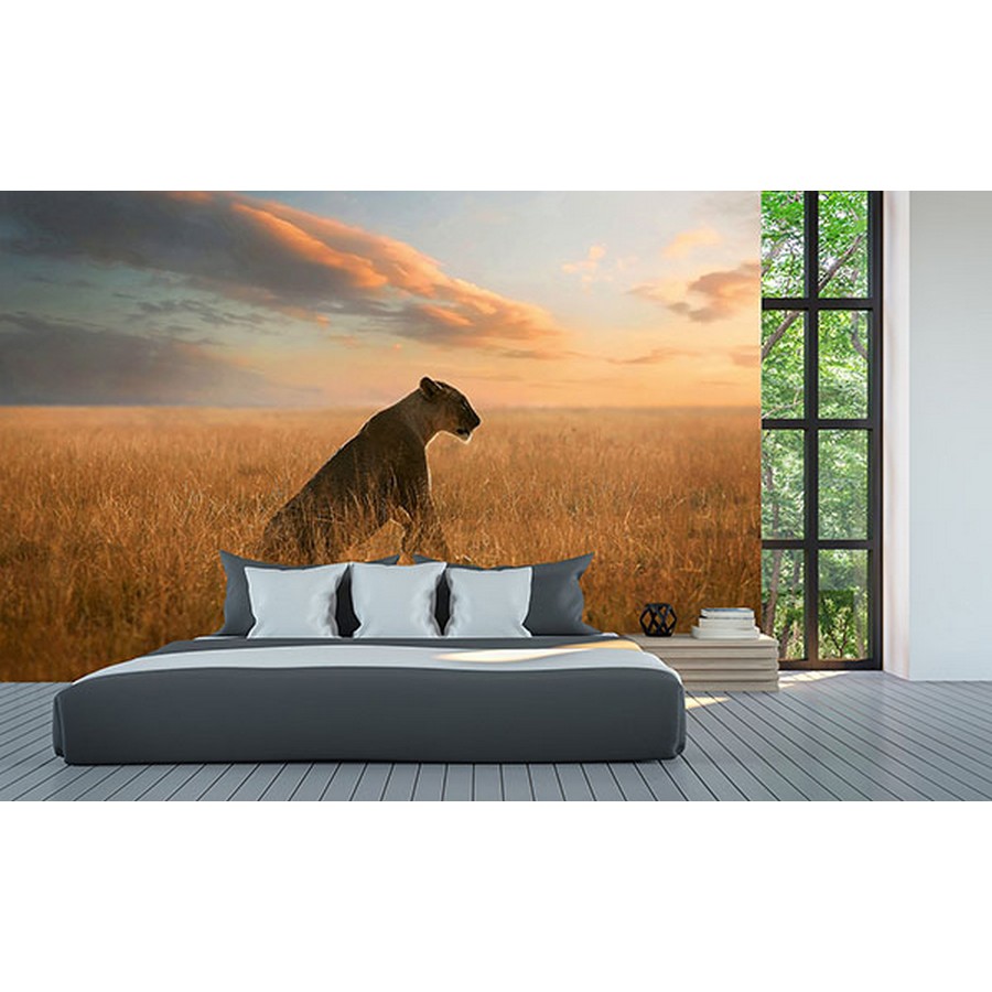 This photographic wall mural features a proud lioness in the wheat grasses of the African plains. Printed on non woven paper and measures 8-ft-3-in tall and12-ft wide when assembled. Lioness Wall Mural comes on 4 panels. Paste is included.
