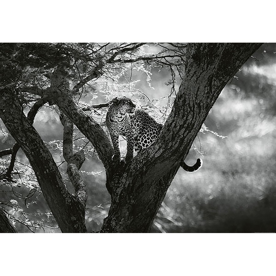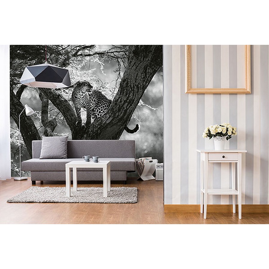 This photographic wall mural features a graceful leopard on a tree in a black and white colorway. Printed on non woven paper and measures 8-ft-3-in tall and12-ft wide when assembled. Leopard On Tree Wall Mural comes on 4 panels. Paste is included.
