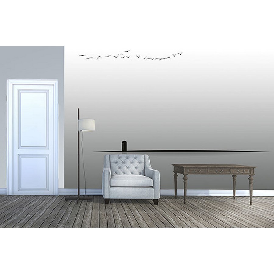 Serene and mysterious, this black and white mural features birds flying over an abstract landscape. Printed on non woven paper and measures 8-ft-3-in tall and12-ft wide when assembled. Abstract Reality Wall Mural comes on 4 panels. Paste is included.