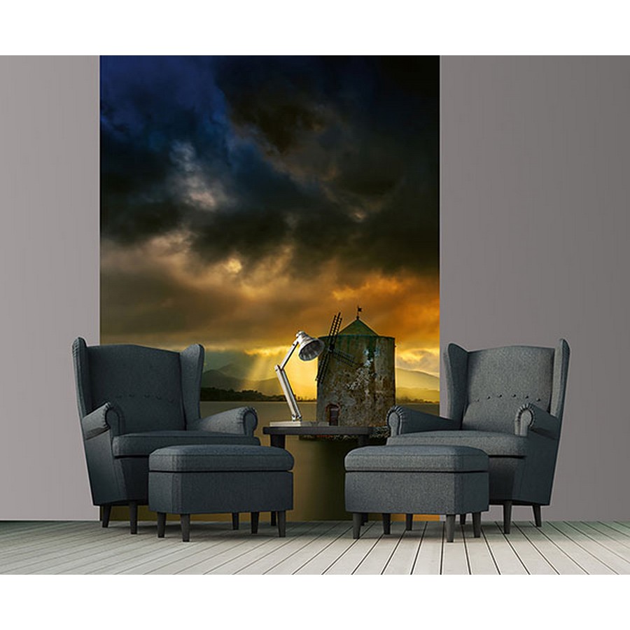 An old windmill stands against a stormy sunrise sky in this photographic wall mural. Printed on non woven paper and measures 8-ft 3-in high and 6-ft wide when assembled. Old Windmill Wall Mural comes on 2 panels. Paste is included.