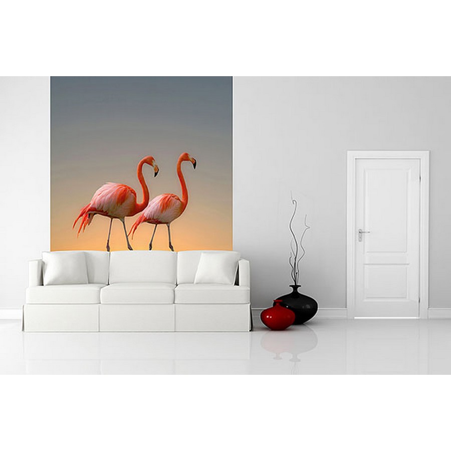 | Flamingos dance across a sun-lit scenery. Printed on non woven paper and measures 8-ft 3-in high and 6-ft wide when assembled. Sunrise Flamingos Wall Mural comes on 2 panels. Paste is included. Repeat: Y Ideal decor Wall Murals Wall Murals # of Pieces: 2 Photographic Birds Birds |