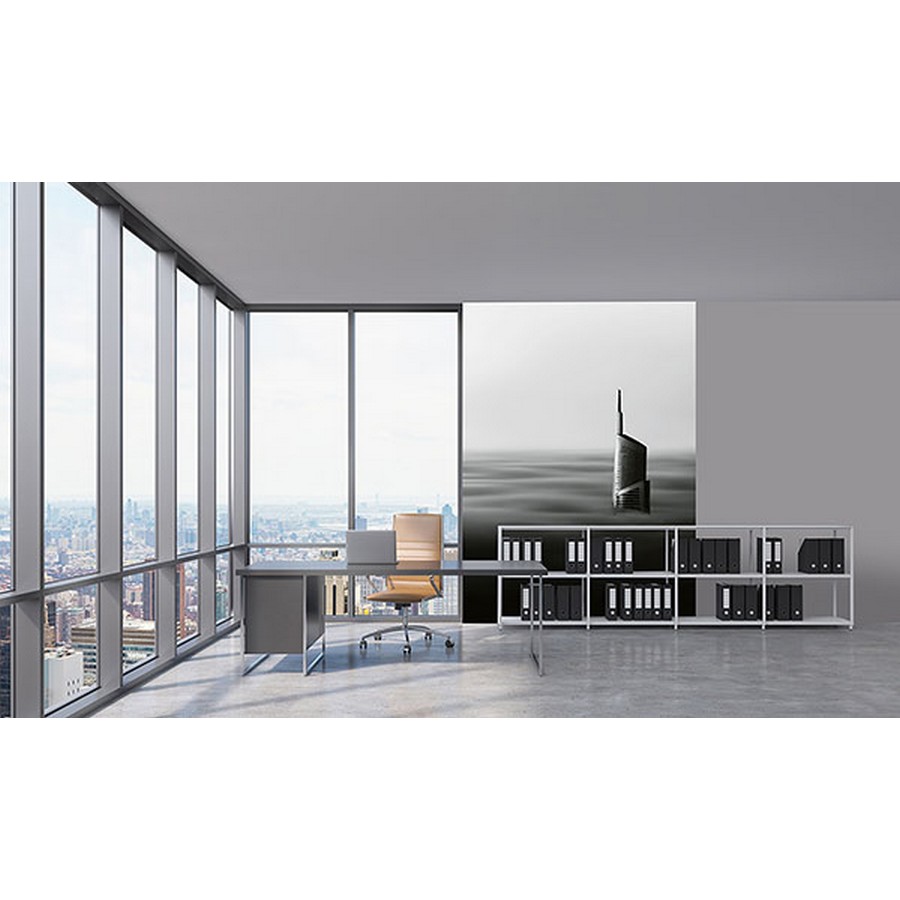 The top of a skyscraper peeks through misty clouds in this black and white mural. Printed on vinyl coated paper and measures 8-ft 3-in high and 6-ft wide when assembled. Cloudy Skyscraper Wall Mural comes on 2 panels. Paste is included.