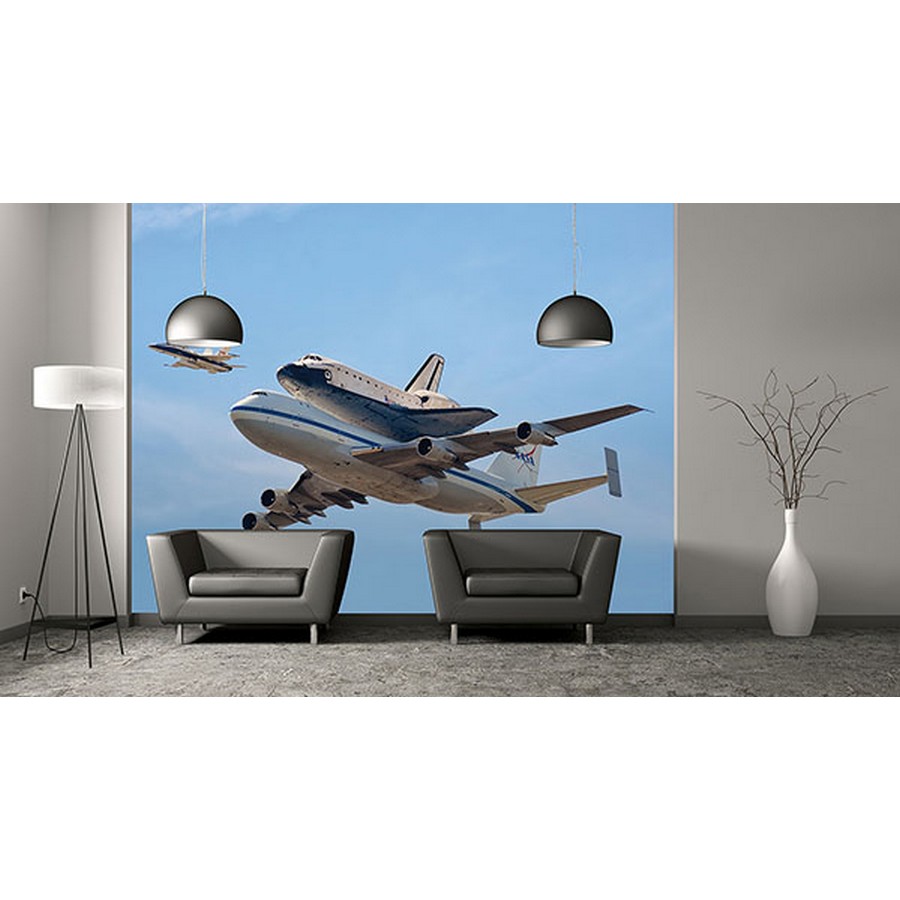 Take flight through blue skies with this room shuttle mural. Printed on vinyl coated paper and measures 8-ft-3-in tall and12-ft wide when assembled. room Shuttle Endeavour Wall Mural comes on 4 panels. Paste is included.