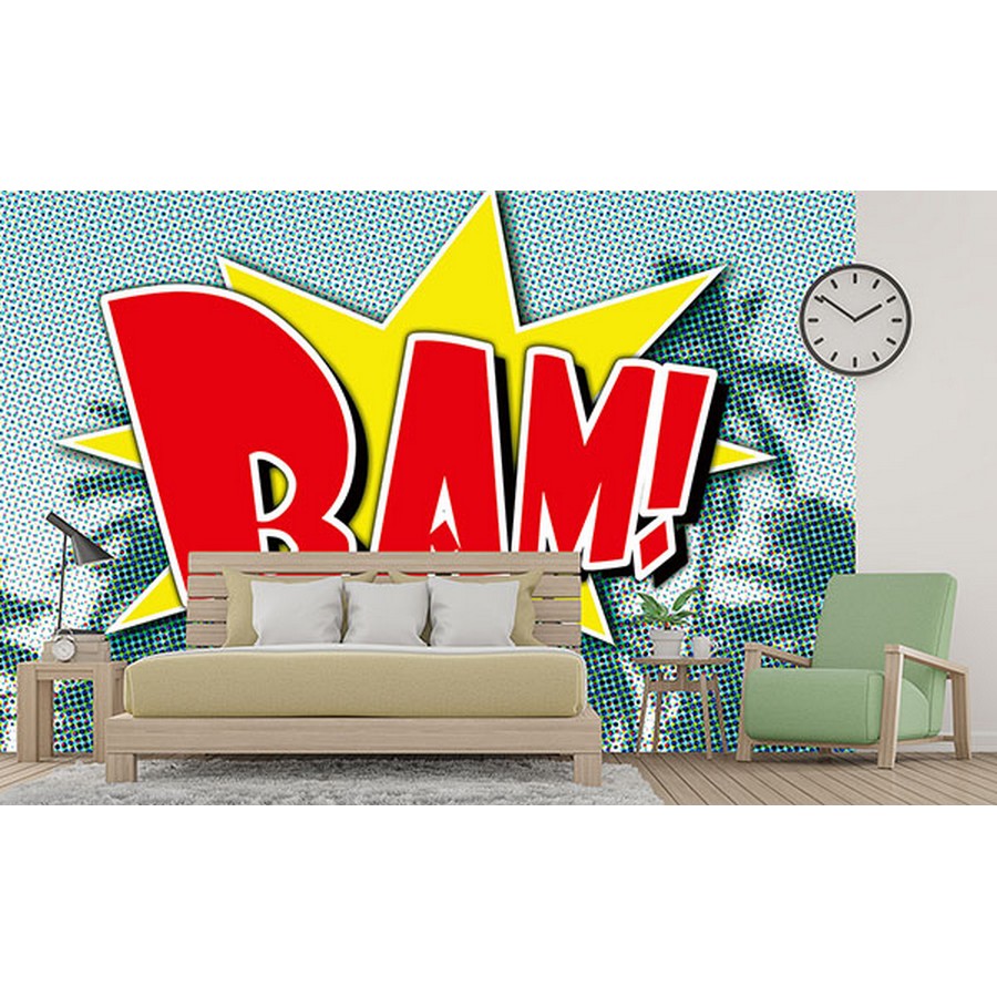 | With a bright red hue, the word, Bam!, pops against a light teal palm tree background. Printed on vinyl coated paper and measures 8-ft-3-in tall and12-ft wide when assembled. Bam Comic Wall Mural comes on 4 panels. Paste is included. Repeat: No Repeat Ideal decor Wall Murals Wall Murals # of Pieces: 4 current Novelty Novelty |