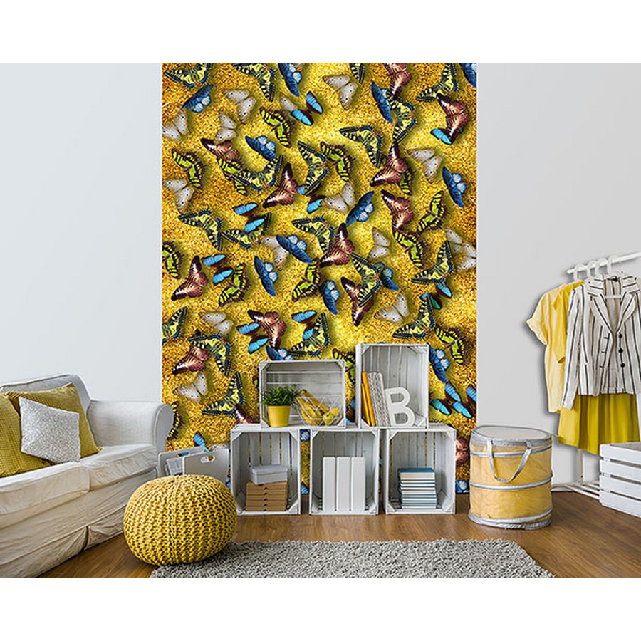 Multicolored butterflies dazzle atop a vivid yellow backdrop. Printed on vinyl coated paper and measures 8-ft 3-in high and 6-ft wide when assembled. Multicolored Butterfly Mural Wall Mural comes on 2 panels. Paste is included.