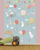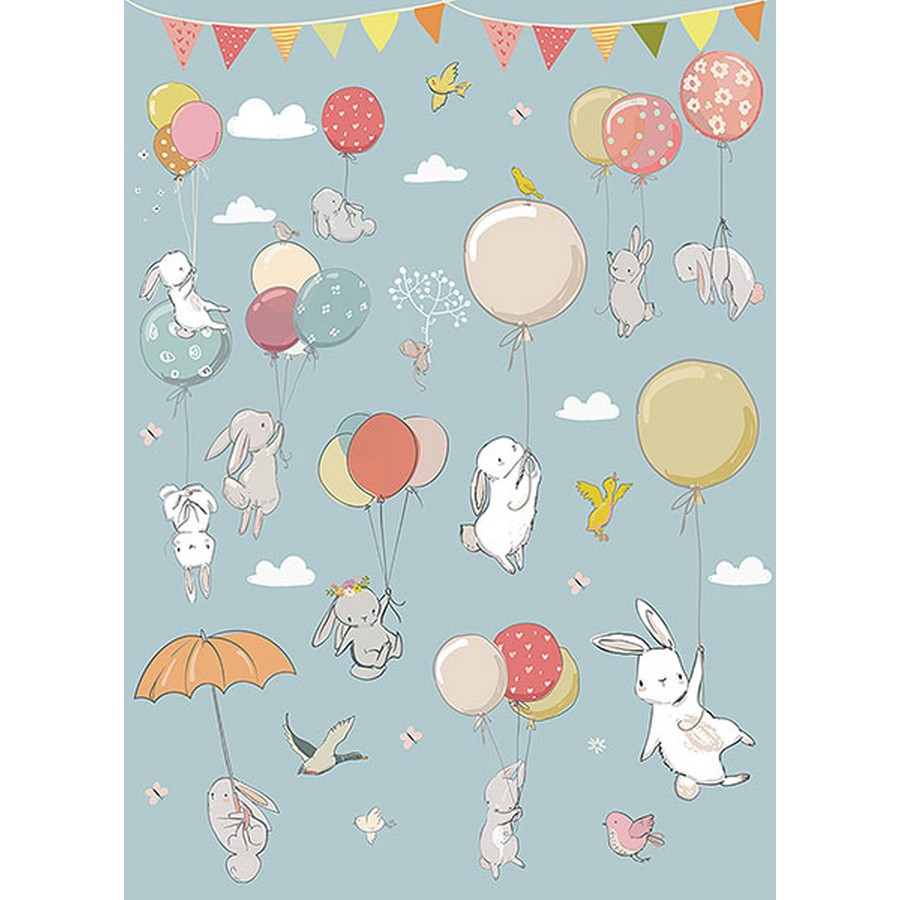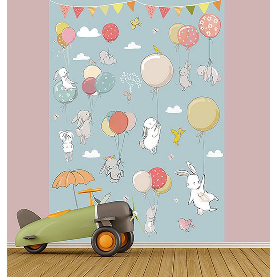 Joyful bunnies play with multicolored birthday balloons in this children's party wall mural. Printed on non woven paper and measures 8-ft 3-in high and 6-ft wide when assembled. Kids Party Wall Mural comes on 2 panels. Paste is included.