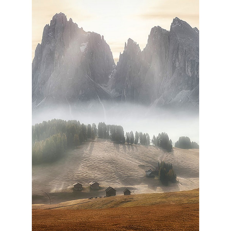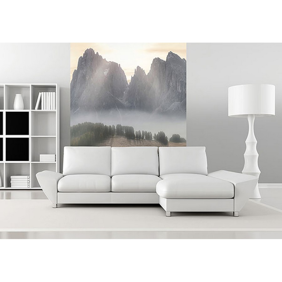 Invite the calm into your home with this mountain mural featuring the sun shining through the misty haze. Printed on vinyl coated paper and measures 8-ft 3-in high and 6-ft wide when assembled. Misty Mountains Wall Mural comes on 2 panels. Paste is included.
