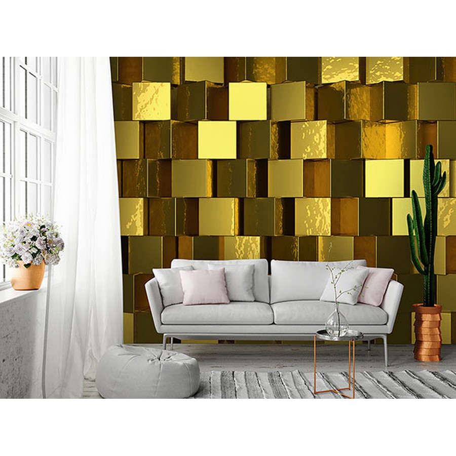 Dimensional cubes stack and make the look of a woven design in this golden mural. Printed on non woven paper and measures 8-ft-3-in tall and12-ft wide when assembled. Golden Cubes Wall Mural comes on 4 panels. Paste is included.