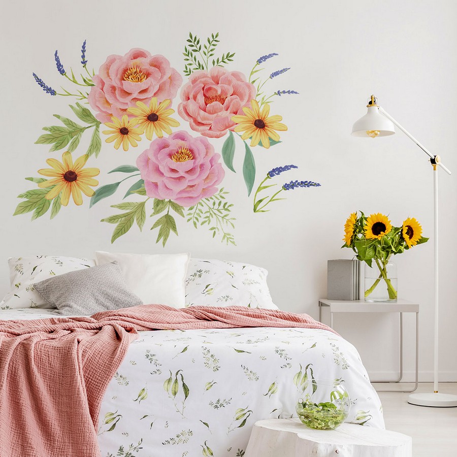 | Pink peonies and yellow daisies will brighten up a room with its happy watercolor design. With added greenery this bouquet looks lively. lovely Peonies Wall Art Kit contains 5 pieces on 2 sheets that measure 24 x 36 inches. This product measures 35-in x 50-in when assembled. Repeat: No Repeat WallPops Wall Art Kits Wall Art Kits # of Pieces: 5 Bohemian Flowers Botanical |