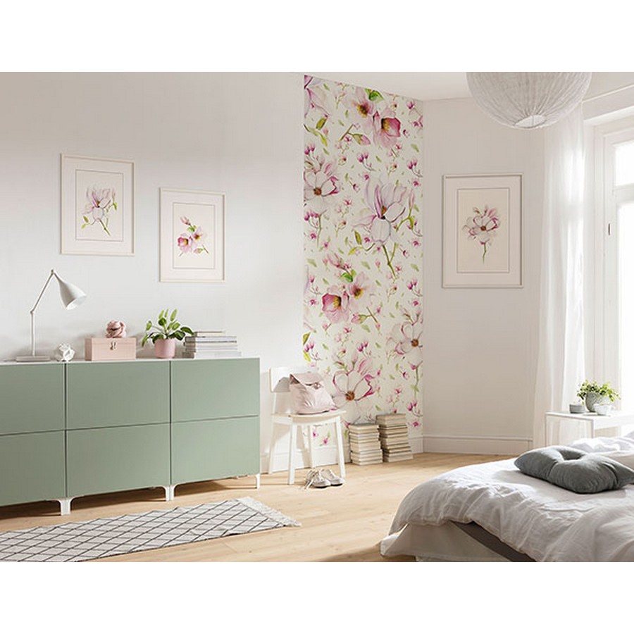 A sweet and romantic floral mural features large scale pink and purple magnolias, creating a charming design. Printed on strippable non woven material and measures 8.2-ft by 3.3-ft when assembled. Magnolia Wall Mural comes on 1 panel.