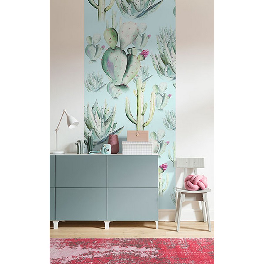 Cacti and prickly pear plants appear in a watercolor design hosted on a pastel blue background in this eclectic wall mural. Printed on strippable non woven material and measures 8.2-ft by 3.3-ft when assembled. Cactus Blue Wall Mural comes on 1 panel.