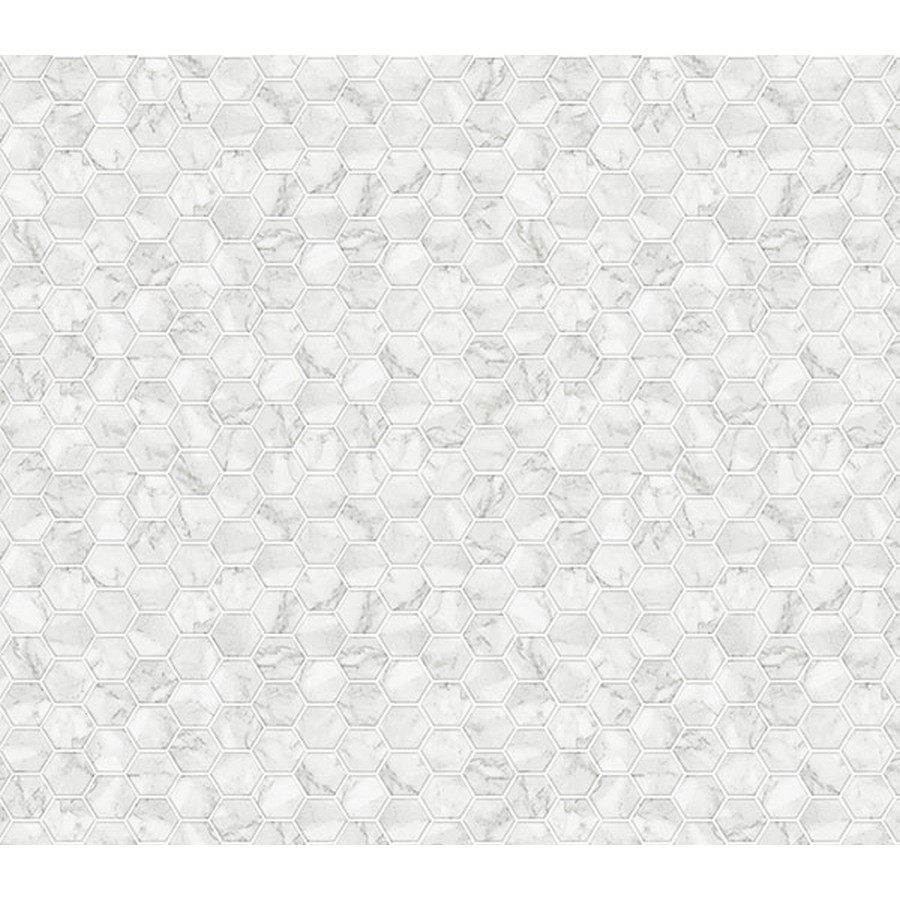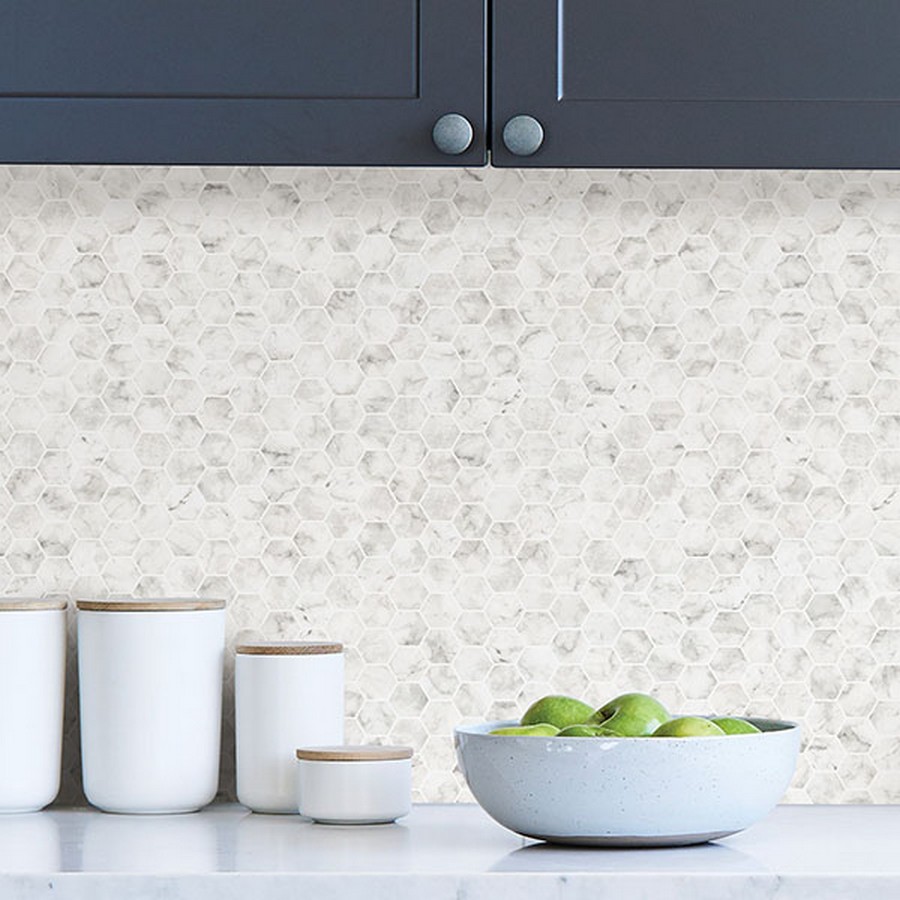 | This peel and stick backsplash has a new color scheme of white and grey shades. The marble inspired design is complete with a small hexagon print. Venatino Carrara Tile Peel and Stick Backsplash contains 1 piece on 1 sheet that measures 108 x 18 inches. Repeat: No Repeat InHome Wall Art Kits Peel & Stick Backsplash # of Pieces: 1 Kitchen & Bath Tiles Graphics Stone Wallpaper |