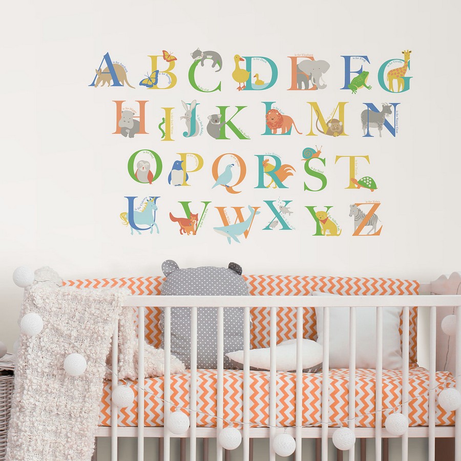 With animals from A to Z, this peel and stick wall art kit is both fun and educational. Its vivid colors and charming pictures are sure to keep children captivated! Alphabet Animals Wall Art Kit contains 26 pieces on 2 sheets that measure 17.25 x 39 inches. This product measures 31-in x 51-in when assembled.