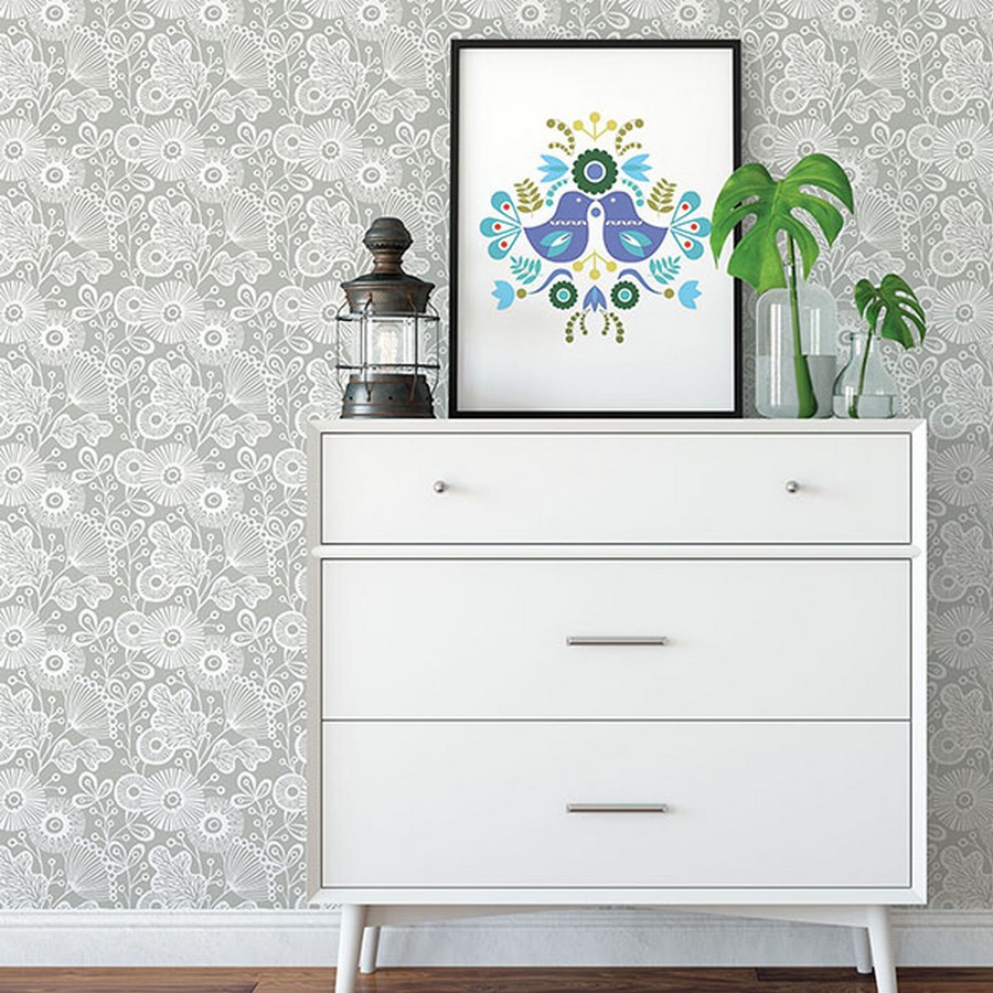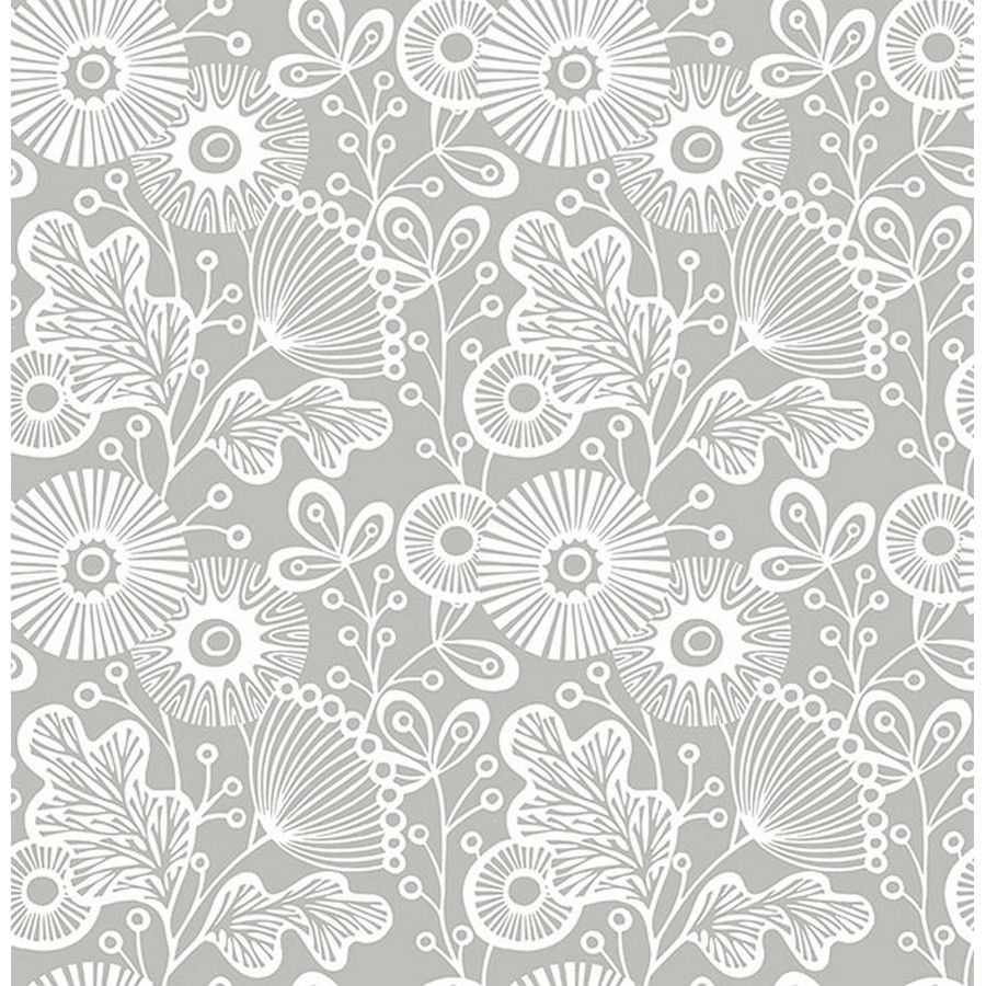 | Inspired by nature's beauty, this botanical design has a Scandinavian flair. Whimsical white flowers blossom against a hip grey background. Mia Peel and Stick Wallpaper comes on one roll that measures 20.5 inches wide by 18 feet long. Repeat: 21 NuWallpaper Peel & Stick Wallpaper Peel & Stick Wallpaper # of Pieces: 1 Scandinavian Flowers Botanical |