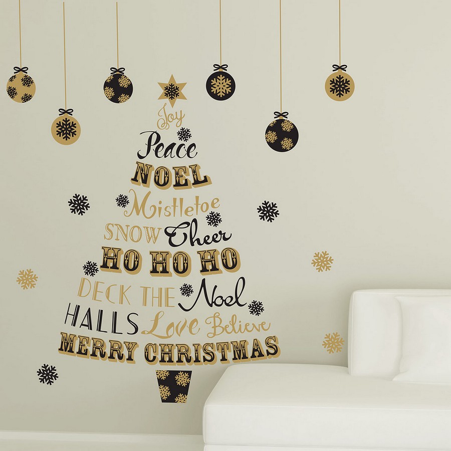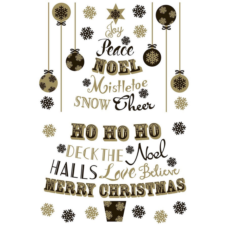 Bring a holiday festivity to your home with this gold and black wall decal. Classic holiday phrases, like Peace, Noel, and Deck the Halls, come together to make a Christmas tree silhouette. Holiday Quote Tree Wall Stickers contains 21 pieces on 2 sheets that measure 27.6 x 19.7 inches. This product measures 27.6-in by 39.4-in when assembled.