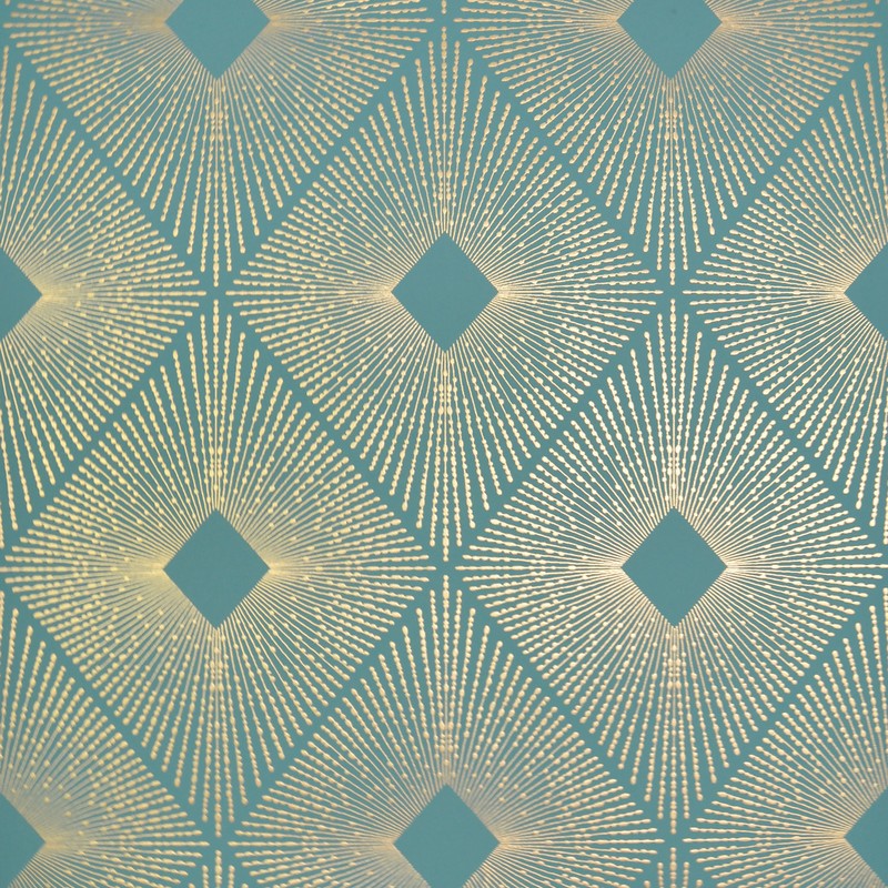 | Radiating beams of metal burst forth from a dismond shape, Antonina Vella Harlowe Wallpaper forms a shimmering aura against contrasting color. Unpasted-Washable-Wet Removable Packaged and sold as a double roll Repeat: 12.6 Match: Straight Antonina Vella Modern Metals Prop 65 Warning |
