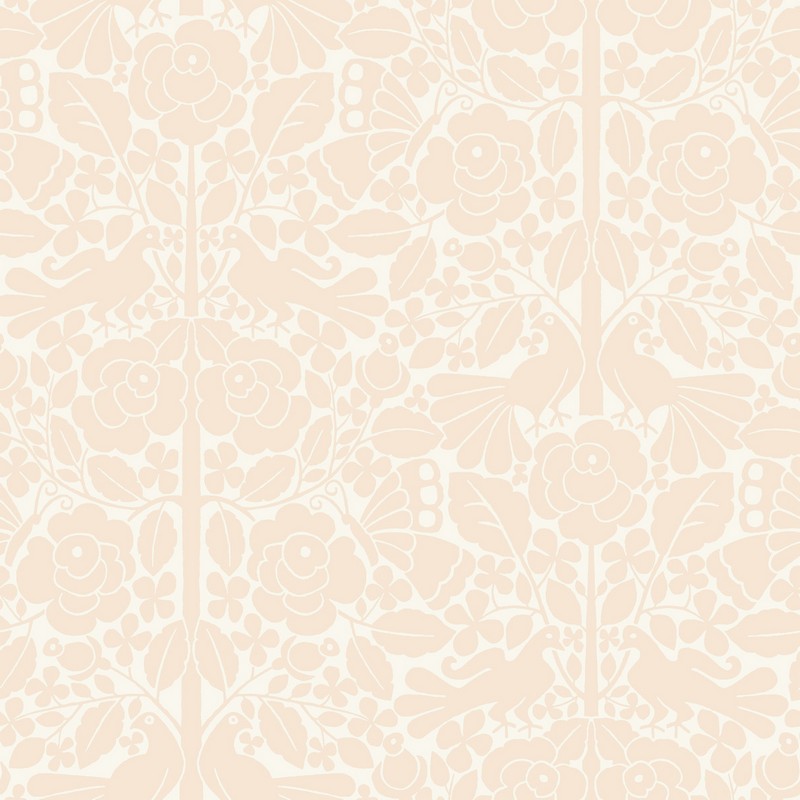 This whimsical pattern depicts an allover white painterly silhouette that is inspired by European folk art prints.